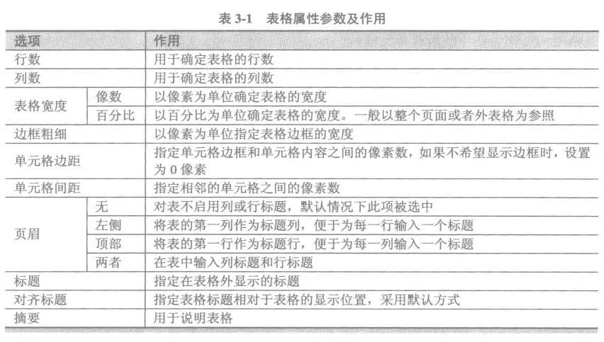 在【表格】对话框中,可以设置待插入表格的属性,设置的参数主要针对表格整体,如表3-1所示。