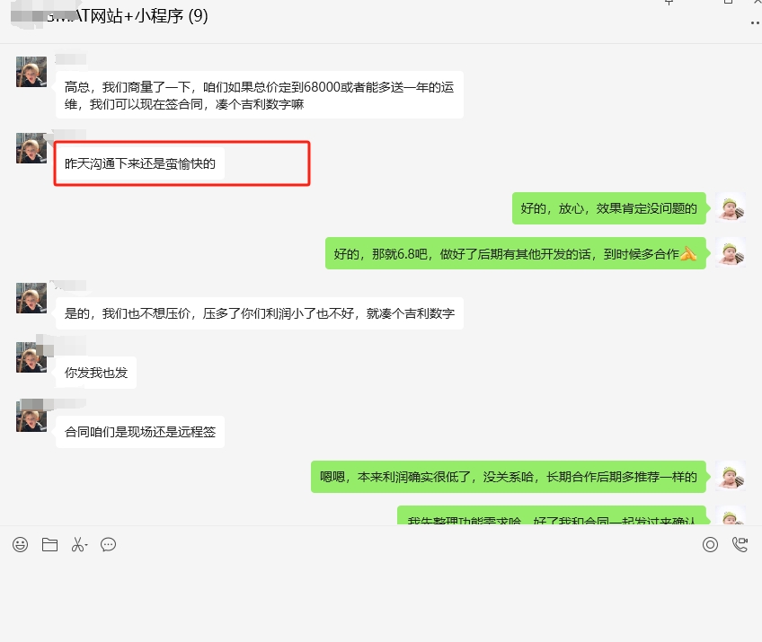 客户是做教育的,需要开发一套针对国外的开始系统,这个系统逻辑还是比较复杂的,客户也对比了4家公司了,和我们聊了之后,第二天就直接定下来了,合同都还没签,已经先把首付款支付了。这个系统在市面上做下来不会低于15万的,我们6.8就搞定!