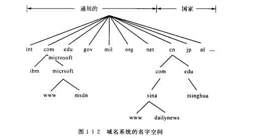 在最初设计城市名称系统的名称空间时,定义了两类顶级城市:一般城市和国家城市。然后,在每个顶级域下划分出更详细的子域。一般顶级域名包括com(商业)、edu(教育机构)、gov(戈尔贡四联邦政府)、in“特定国际组织”、mil(美国军事组织)、net(网络提供商)和org(非竹)利益组织)。 National City的每个分支都是一个国家,比如中国的顶级域名就是cn。域名系统的名称空间如图1-1-2所示。