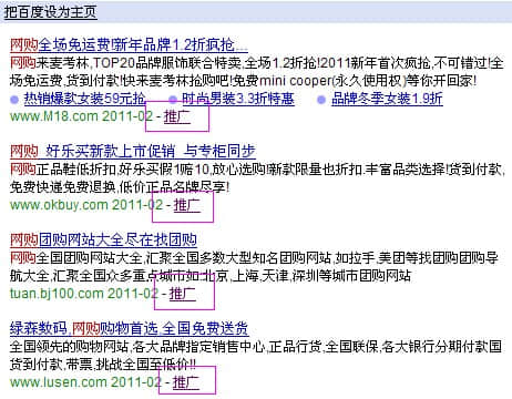 然后去百度搜索关键词“网购”。如图所示,首页前9项全部被“推广”占据,然后下面的也被大网站占据。这类极度热门的关键词,如果没有雄厚的资金,是很难在首页排名的,所以建议不要选择!