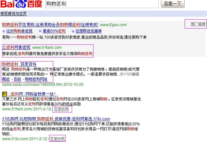 我们可以选择竞争较小的关键词,比如“购物返利”,首页前两项是促销,第三项是百度百科,其次是百度快照,竞争不是那么激烈,搜索也有上百条每天,你可以根据自己的能力选择这些关键词!如图所示: